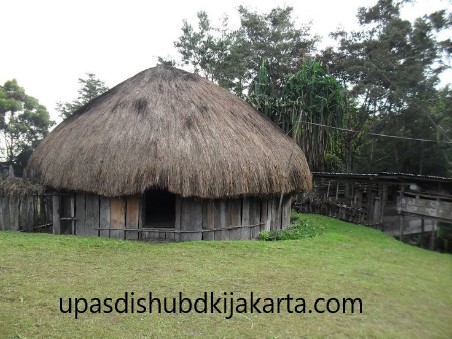 Rumah Honai khas masyarakat Papua berbentuk bulat dengan atap ilalang yang rendah, dirancang agar hangat dan nyaman di iklim pegunungan. Rumah ini juga menjadi simbol kekuatan dan ketahanan masyarakat Papua terhadap lingkungan alam yang keras.